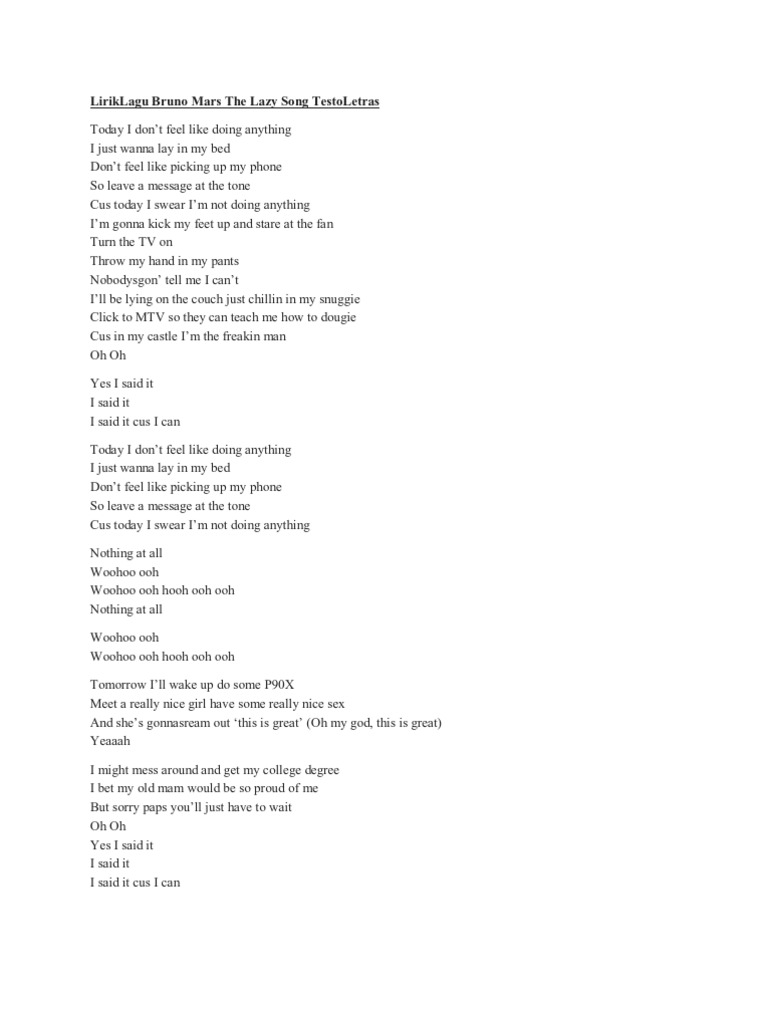 Lirik Lagu Bruno Mars The Lazy Song Testo Letras Songs Written Singles